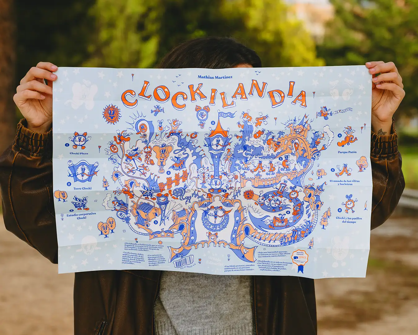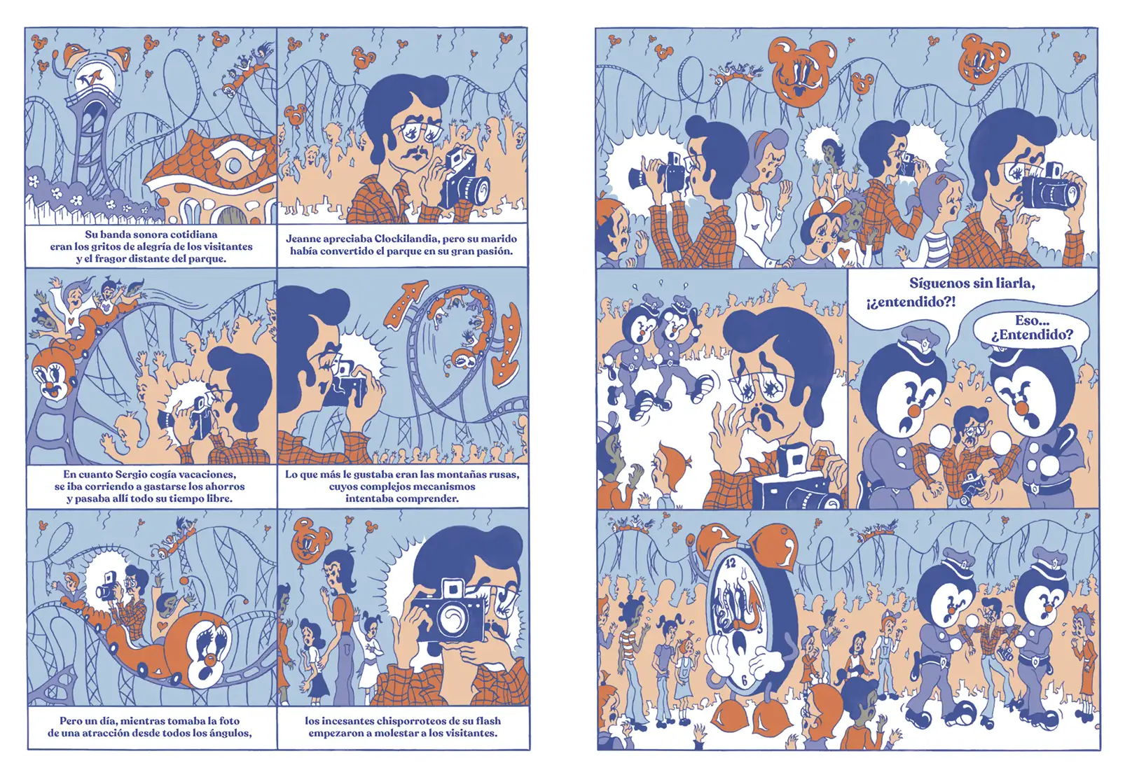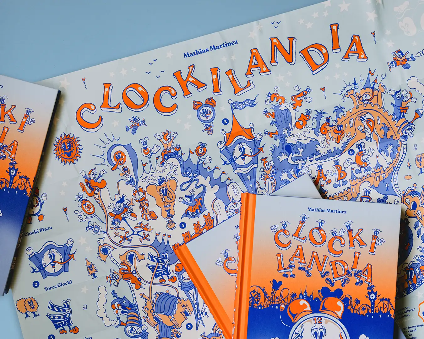 En Clockilandia, Mathias Martinez reconstruye la memoria de un parque imaginario para mostrar la cara oculta de su éxito. Cada capítulo sigue a un personaje distinto —una mascota, un aficionado a las atracciones, una ex empleada y una niña— que da testimonio de un momento clave de su historia. Inspirado en cartoons de los años 30 de los estudios Fleischer, Martinez retuerce ese imaginario hasta lo grotesco: dibujos que gotean, decorados que se derriten y perspectivas deformadas como una película quemada en el proyector, creando una atmósfera tan fascinante como inquietante.
