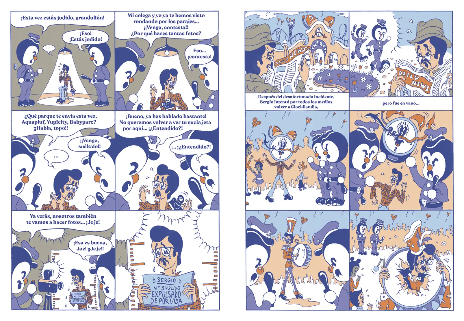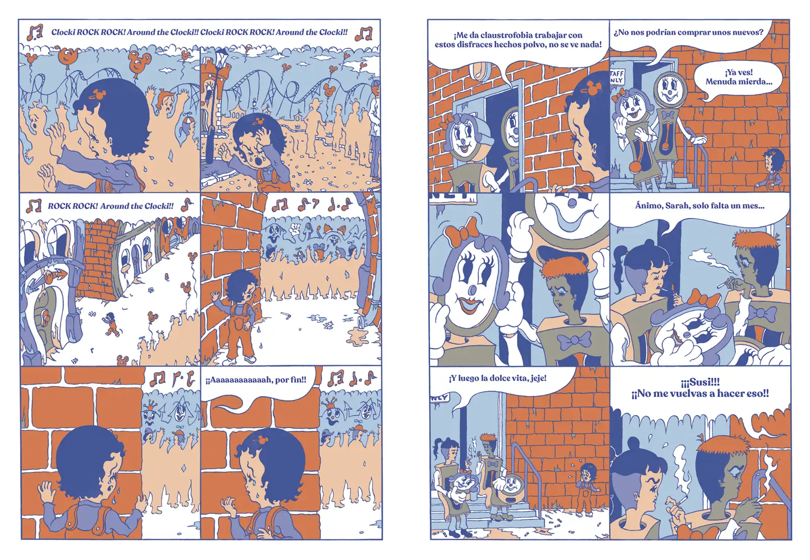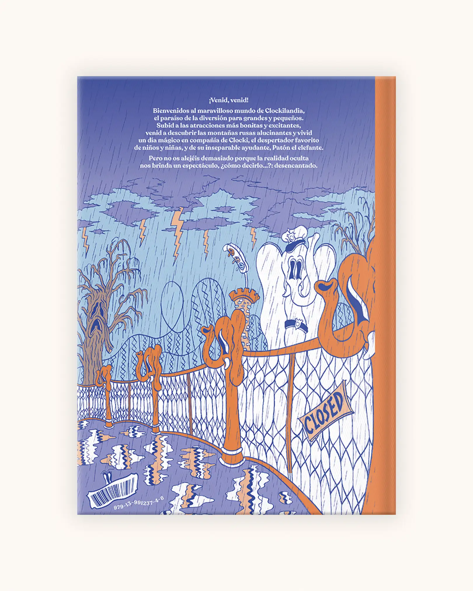 En Clockilandia, Mathias Martinez reconstruye la memoria de un parque imaginario para mostrar la cara oculta de su éxito. Cada capítulo sigue a un personaje distinto —una mascota, un aficionado a las atracciones, una ex empleada y una niña— que da testimonio de un momento clave de su historia. Inspirado en cartoons de los años 30 de los estudios Fleischer, Martinez retuerce ese imaginario hasta lo grotesco: dibujos que gotean, decorados que se derriten y perspectivas deformadas como una película quemada en el proyector, creando una atmósfera tan fascinante como inquietante.