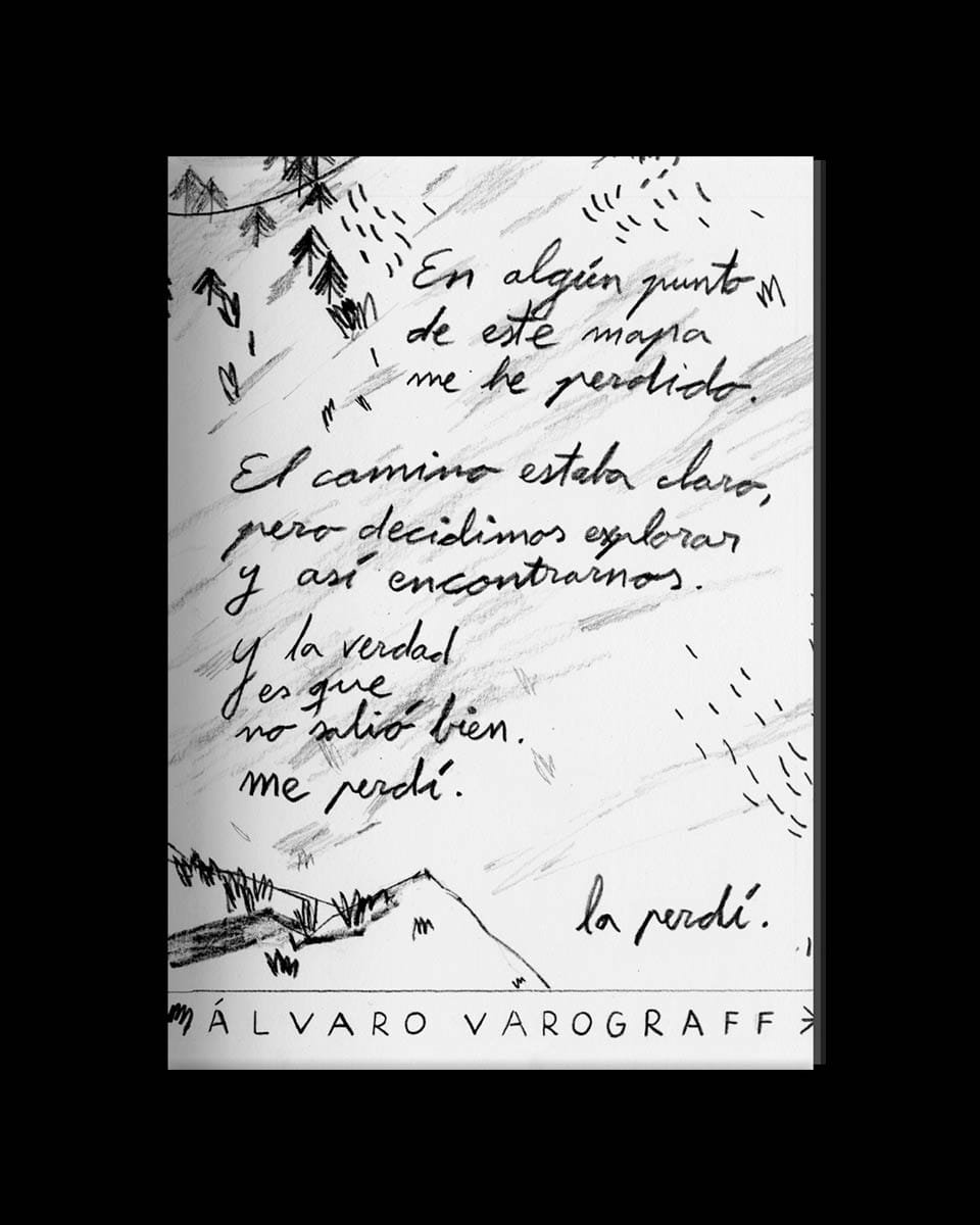 Me perdí trata de materializar en formato libro ese sentimiento de desorientación y abandono que se siente cuando te sientes perdido, sin rumbo, como perderse en la noche en un bosque. Este libro de artista es completamente negro, desde la tinta hasta el papel, el cual está cubierto por un mapa de donde puede haber sucedido esa pérdida, el único elemento blanco que complementa el sentido material del trabajo.